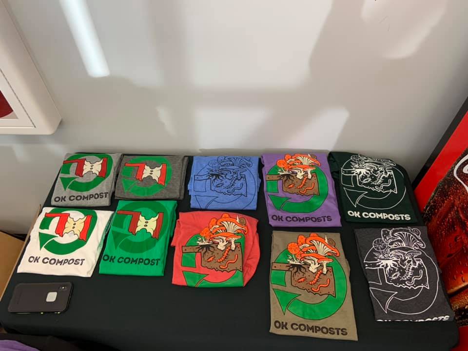 Approximately 115 registrants enjoyed browsing information from 16 sponsors/vendors and attending some of the 8 sessions. Topics ranged from Compost in Agriculture to a Soil Erosion Demonstration to a panel about Compost & Sustainability in Oklahoma Businesses (and more). A smoking t-shirt design even made a debut.